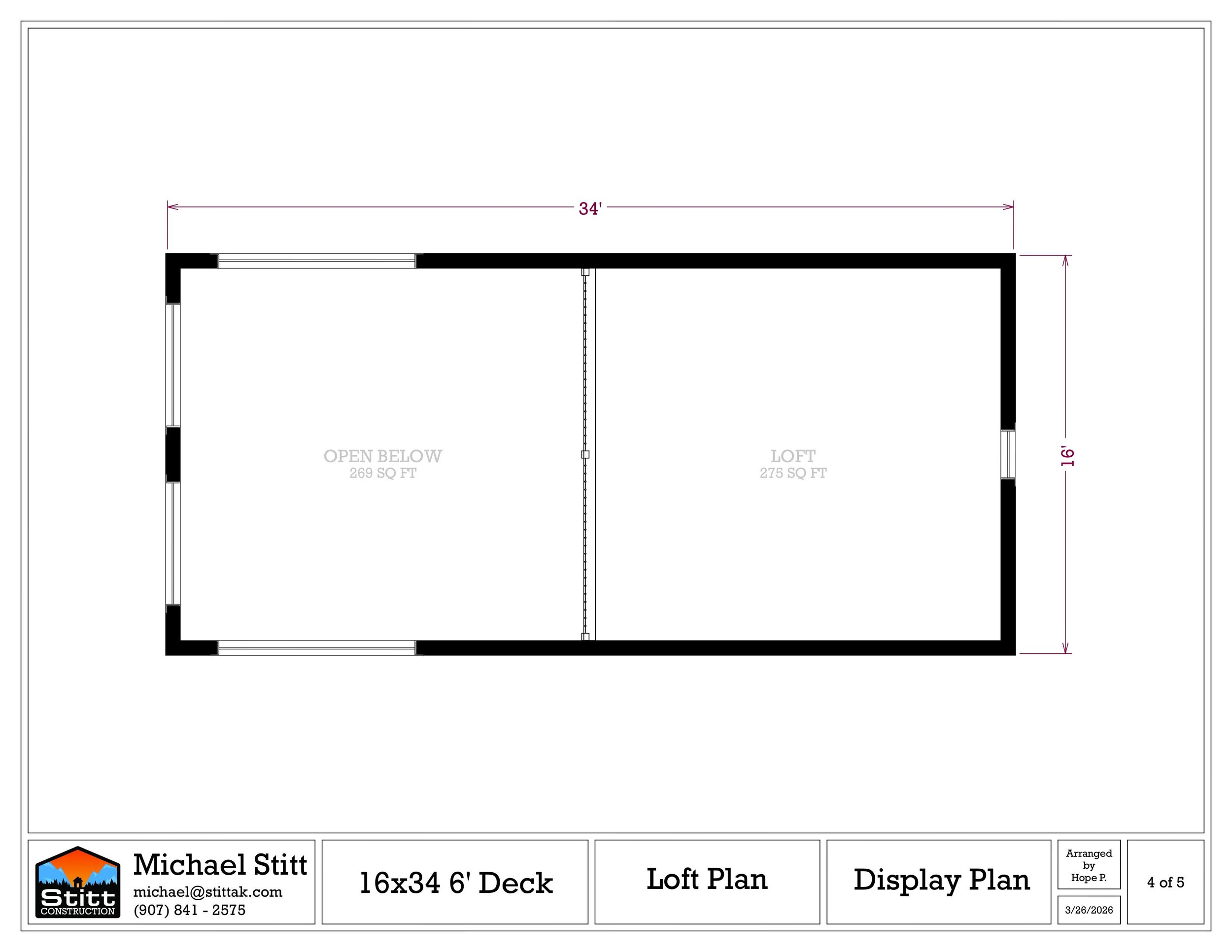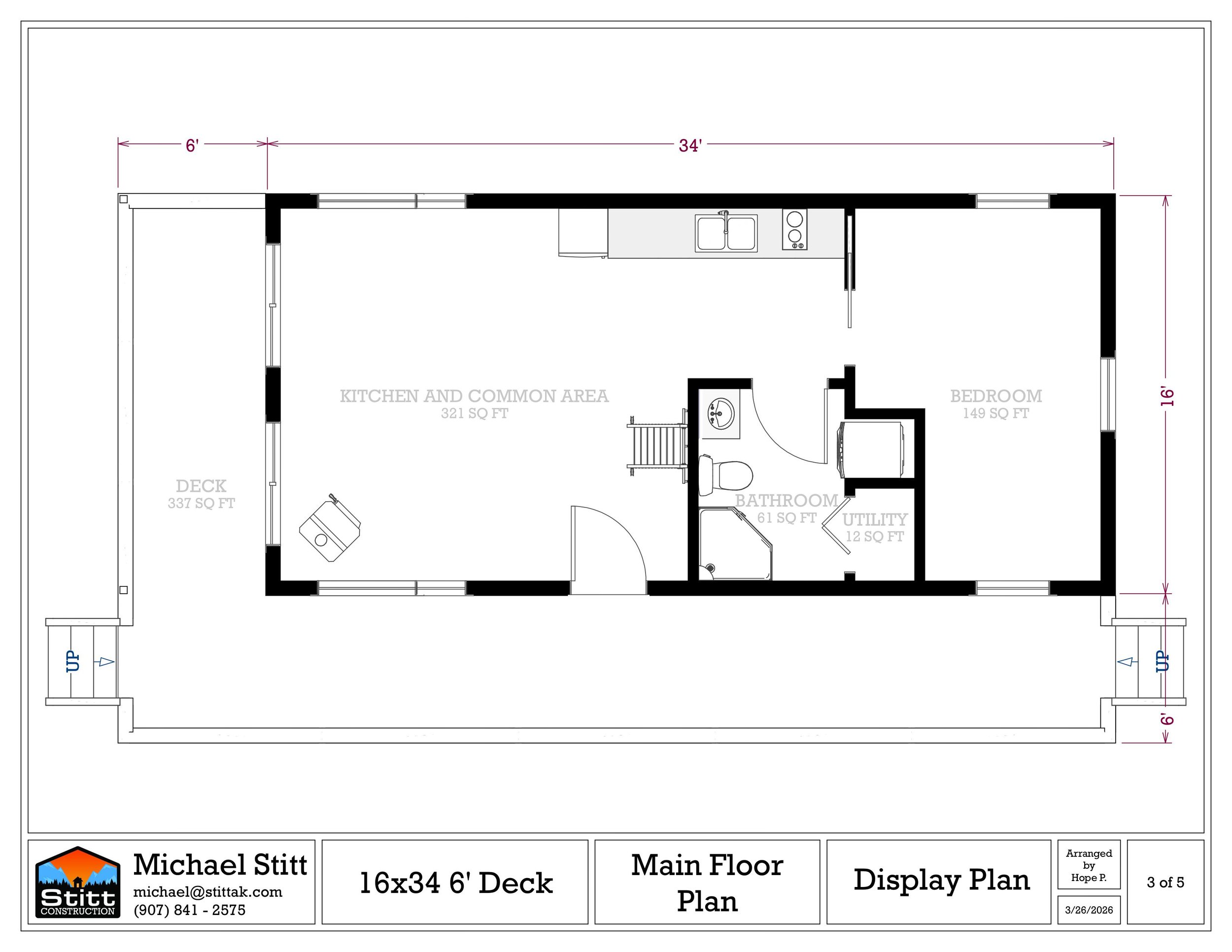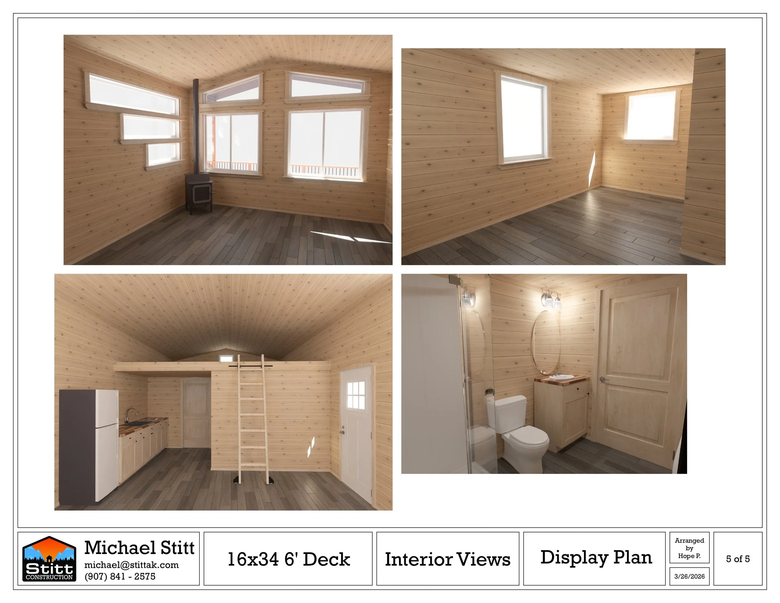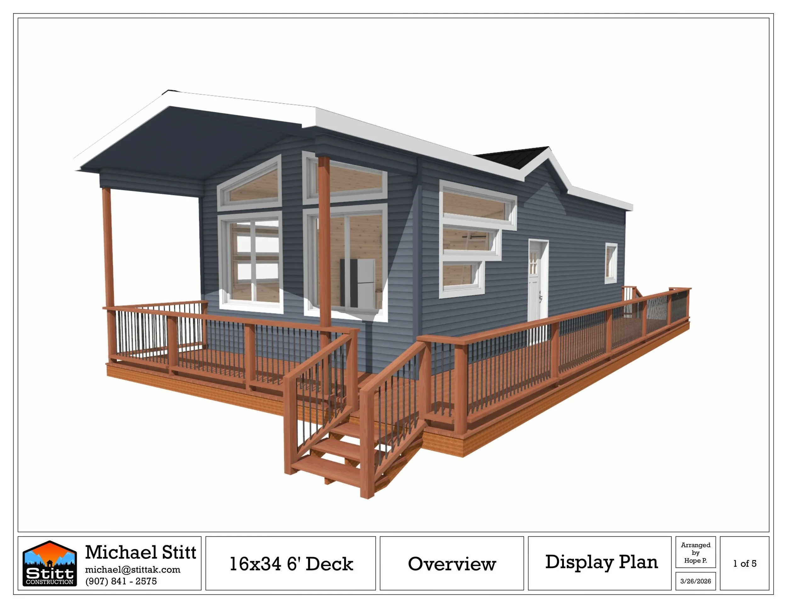 This one bed, one bath home with a full kitchen lets in lots of natural light with stacked and trapezoidal windows. Main floor square footage is 543, and a half-loft maximizes space while maintaining an open, vaulted living room. A 6’ wide, 337 square foot deck wraps two sides of the home.